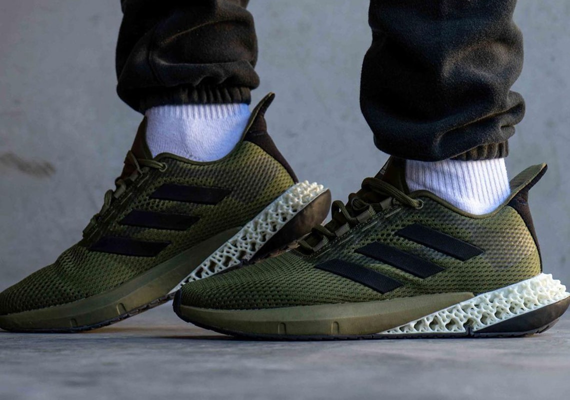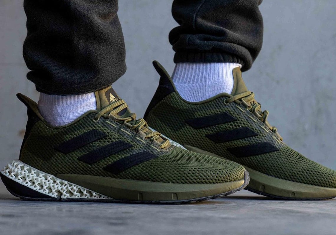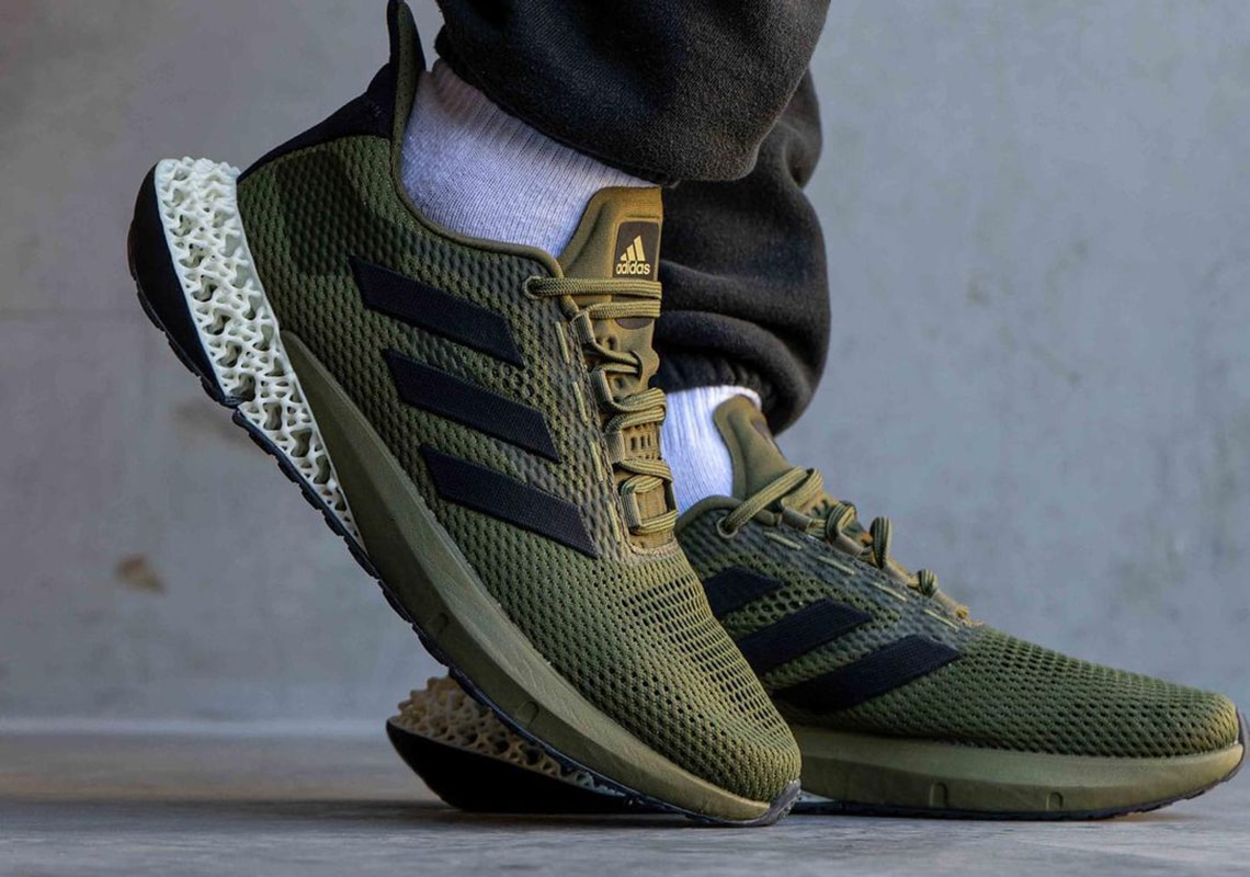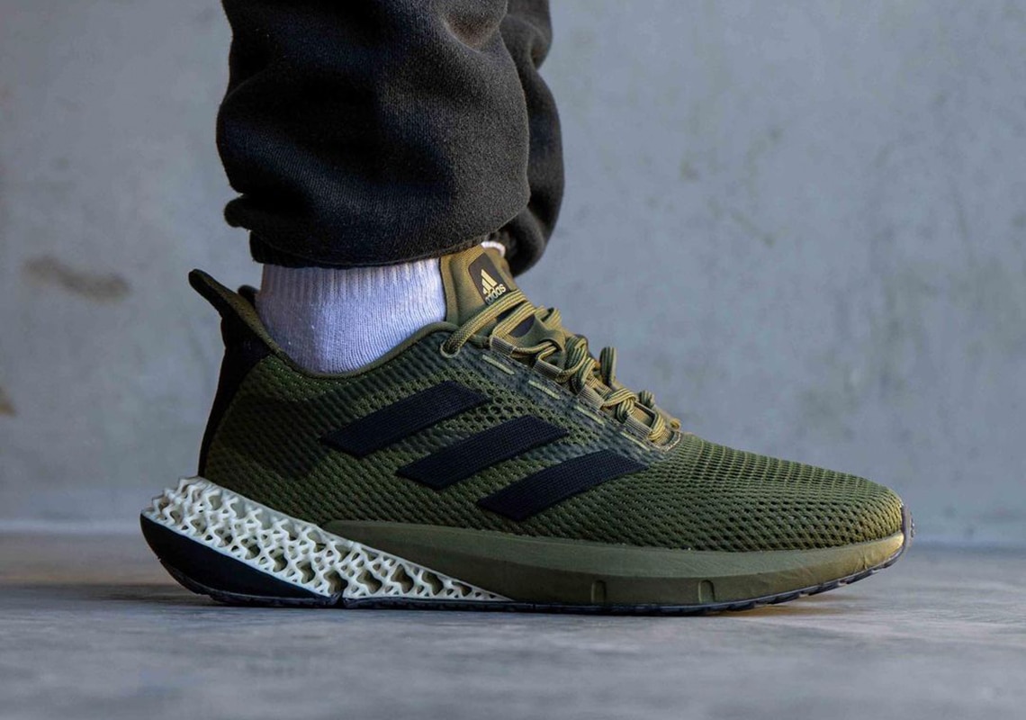 This debut colorway features an olive mesh design while olive green covers the tongue, lacing system, and rubber midsole as well. For contrast, black Three Stripes branding is placed on the sides while a carbon green 4D heel displays organic tones as a black outsole finishes the new design.