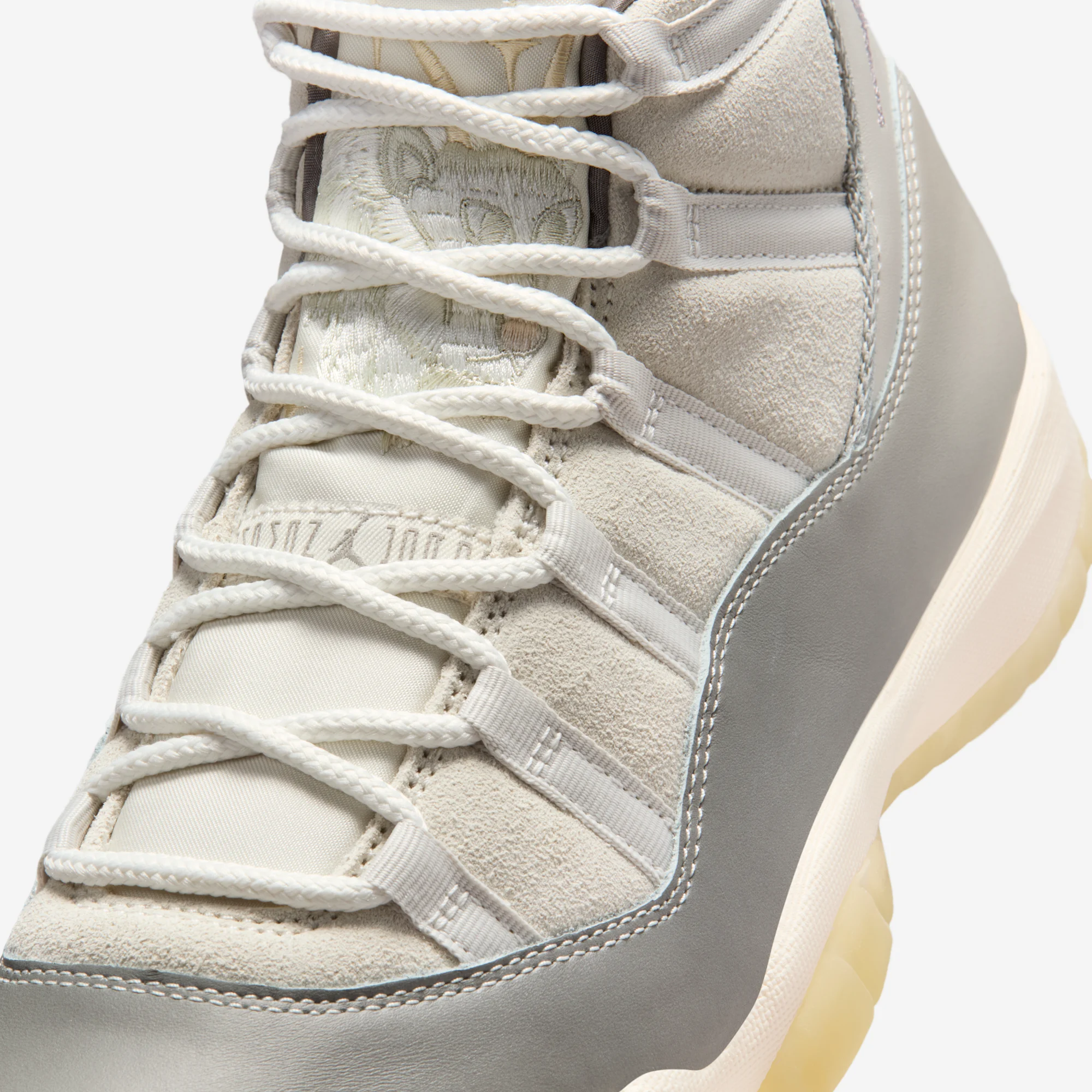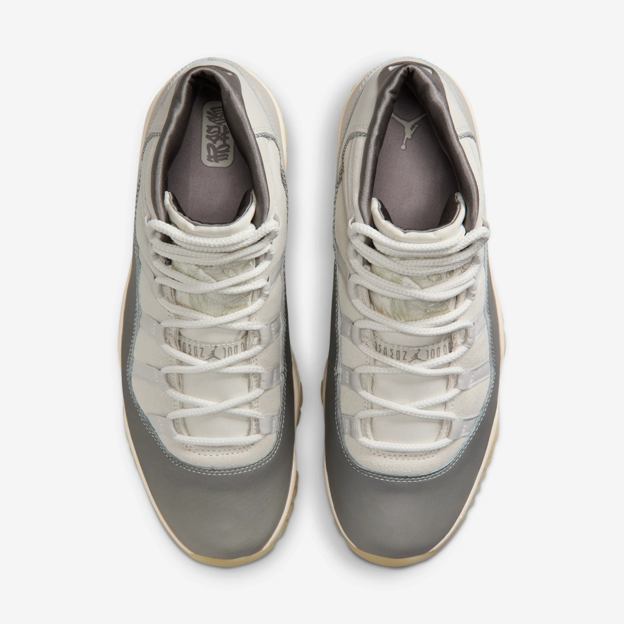 The announcement of Jordan’s Anniversary series for the 11 this morning caught us by surprise. We’ve been so busy celebrating forty years of the AJ1, we almost forgot about what is arguably the brand’s second most important silhouette. For their final stop on the globe-trotting adventure, the Jordan 11 is touching down in Japan, with a “Tokyo” inspired look. The new style features a suede base layer in Light Bone, paired with a gradient leather mudguard that lightens its grey tone from toe to heel. The rear panel of the shoe comes in smooth nubuck and features an embroidered Jumpman logo. The tongues are the best, and best hidden detail, featuring traditional Japanese embroidery style and artwork in the shape of a goat. Finally, a map along the outsole nods to MJ’s road to many championships.