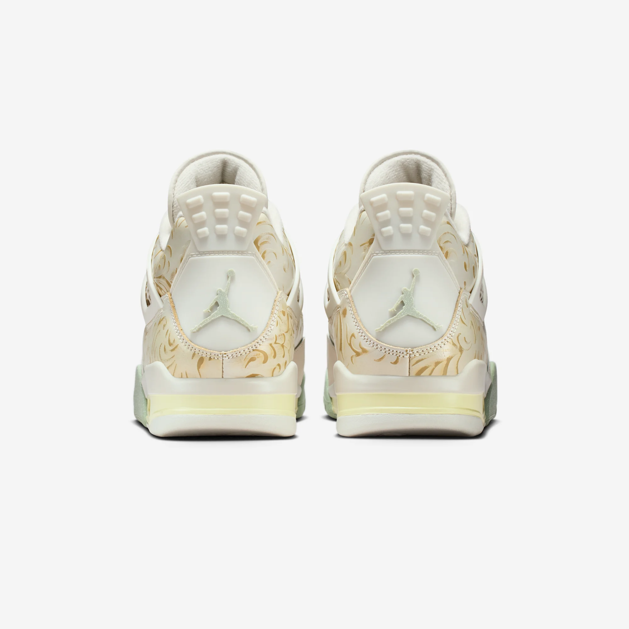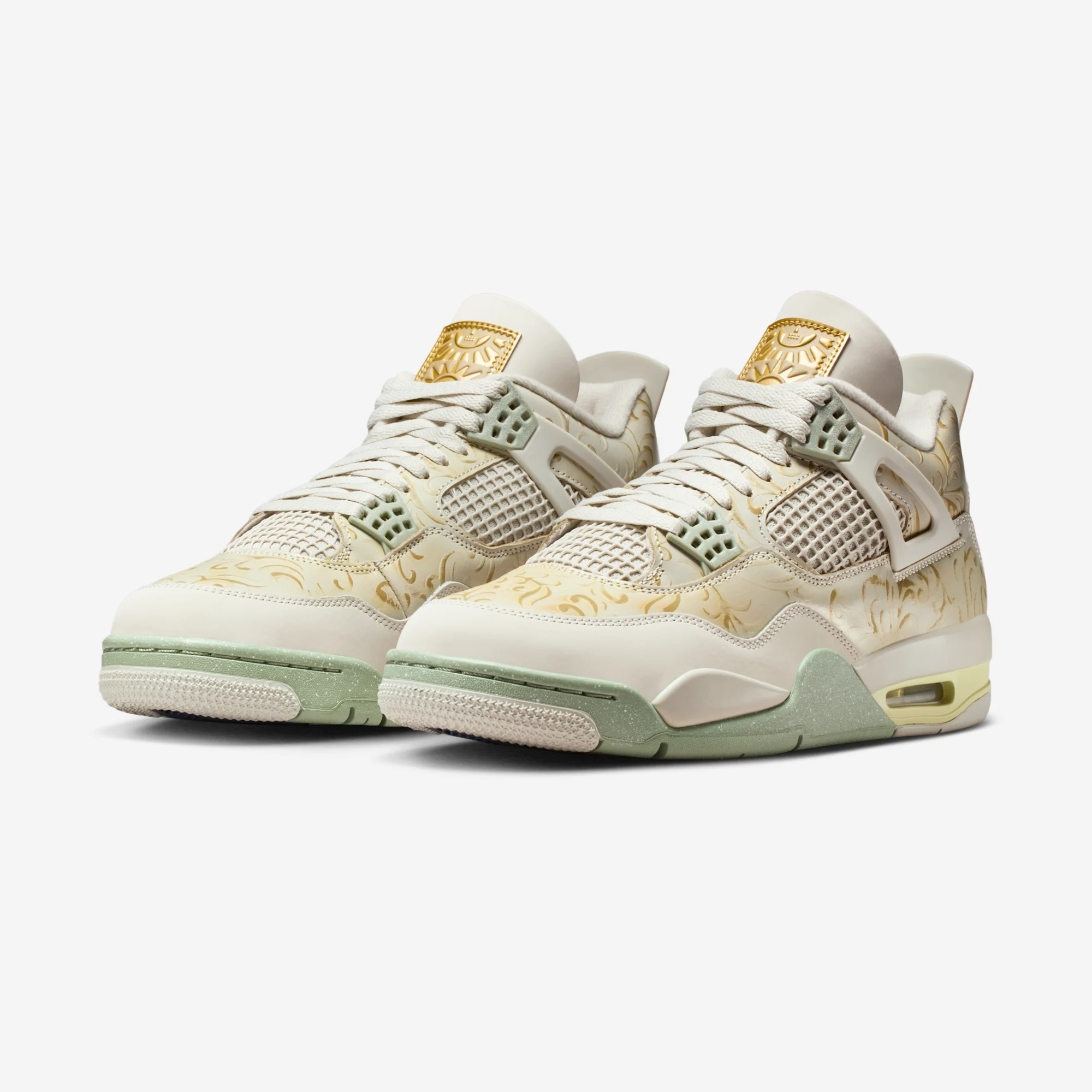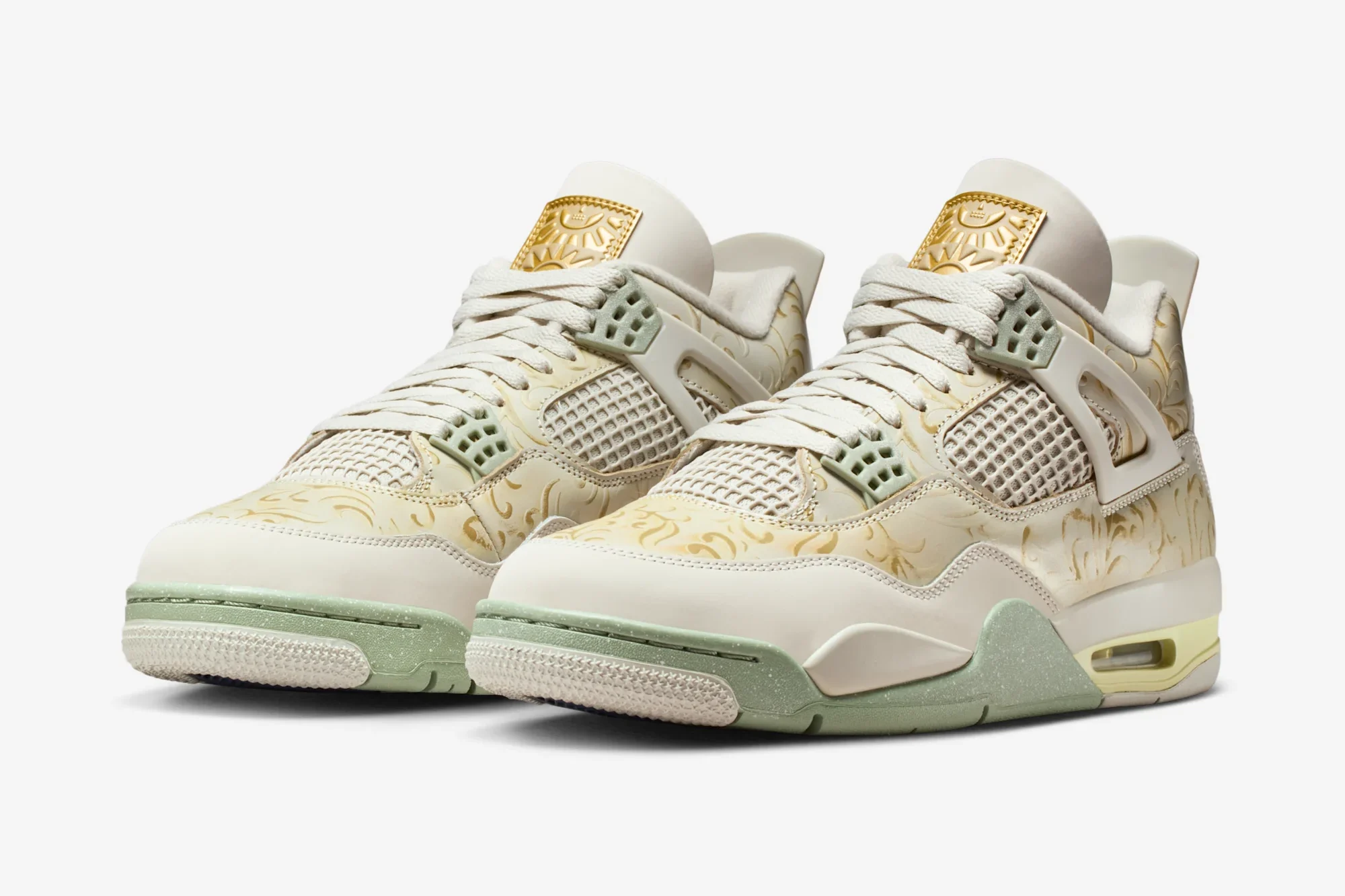 These releases have showcased Nike’s commitment to cultural appreciation and community connection, and this week we have our first official look at this year’s installment. The theme for the 2025 collection is “Somos Eternos”, translating to ‘we are eternal’ in English. This simple phrase encapsulates the belief that loved ones who have passed on are kept alive by memories and traditions. The Air Jordan 4 is getting an SE variant release for the project, casting the shoe in a Soft Pearl white color scheme, paired with Jade green accents. The shoe’s upper is intricately decorated gold floral pattern, and features a special tongue tag that gives the impression of a gold wax stamp.