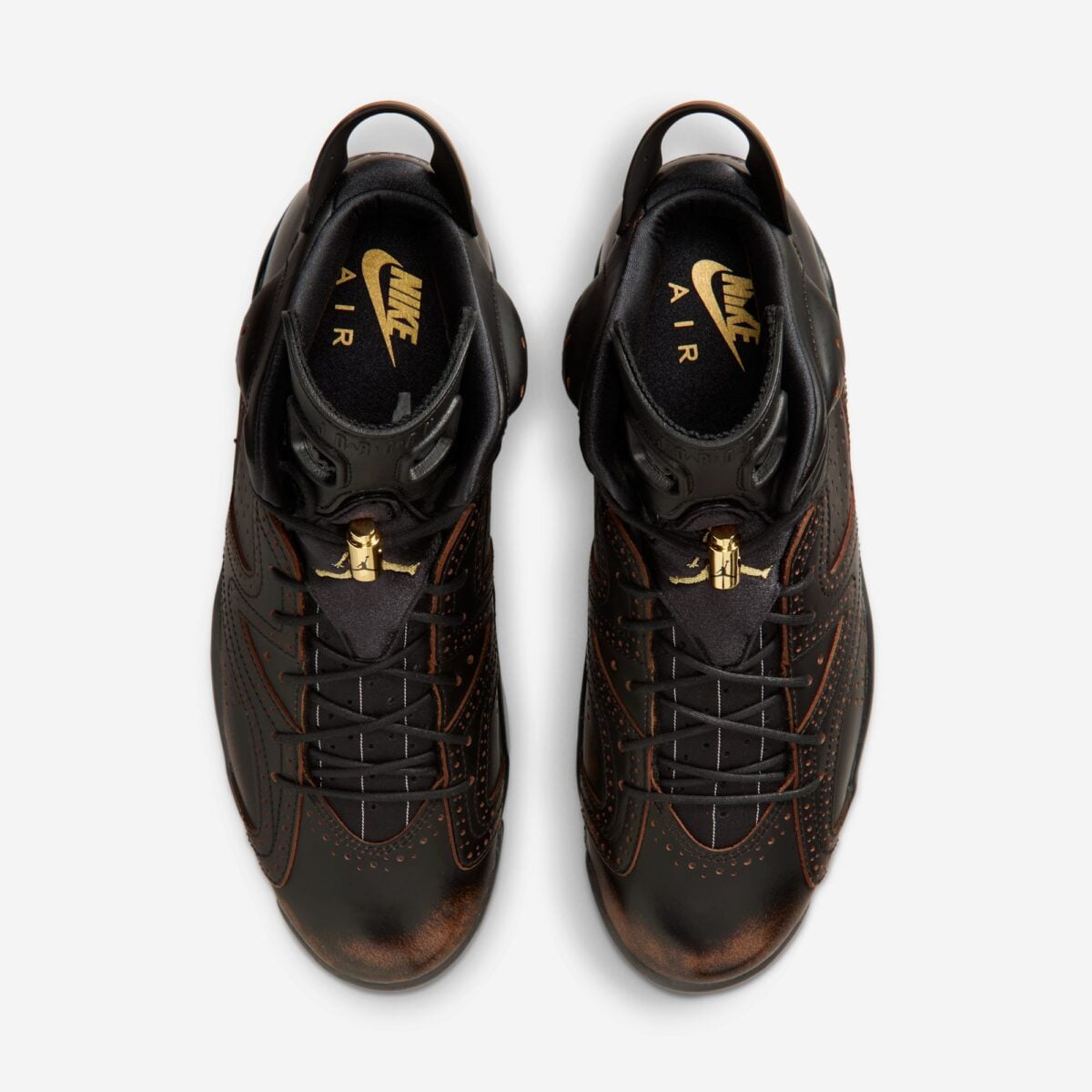 Jordan Brand has contributed to Nike’s Lunar New Year annual releases since their inception, but recently the brand has started it’s own line of special releases arriving early in the year. The first pair arrived last year, featuring the Air Jordan 1 in a special “Xuanwu” colorway for the Year of the Snake. The name comes from Chinese mythology, translating to ‘mysterious warrior’ or ‘dark warrior’. Xuanwu is one of the four main symbols of Chinese cosmology, often depicted as a tortoise intertwined with a snake, symbolizing longevity and resilience. For this year’s release, the Air Jordan 6 is getting a premium upgrade, constructed entirely in very dark brown leather, showing early signs of patina around areas where the leather is stretched in the process of manufacturing, particularly the toes. This pair also incorporates brogueing details for the overlays and the toe box, combining dress shoe styling with the classic silhouette. Painted edges and gold detailing complete this special edition look.
