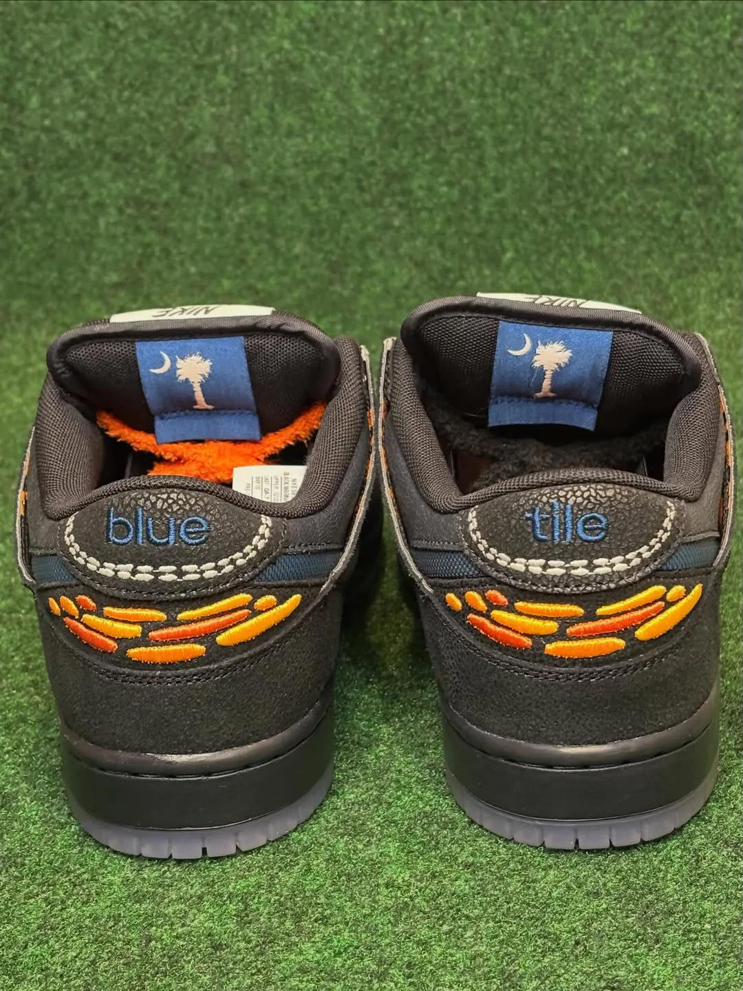 Nike SB’s collaborations with local skate shops have been a defining part of its cultural DNA since SB’s launch in 2002, when Nike first seeded Dunks through independent skate stores to support the communities that kept skateboarding alive. Over the last twenty-plus years, the SB team has worked closely with their retail partners, giving nearly every local shop a chance to design their own sneaker release, typically in the form of the Dunk Low. This month, South Carolina shop Bluetile has begun to tease their version of the iconic sneaker, sharing early looks via an unboxing video last week. Their take on the silhouette brings plenty of texture to the upper, combining black and dark blue cracked leather with a woven nylon Swoosh. The heels are wrapped in embroidered tile details in orange and white, with their name across each shoe. The South Carolina flag is hidden on each of the inner tongues, and two sets of fuzzy laces round out the new design.