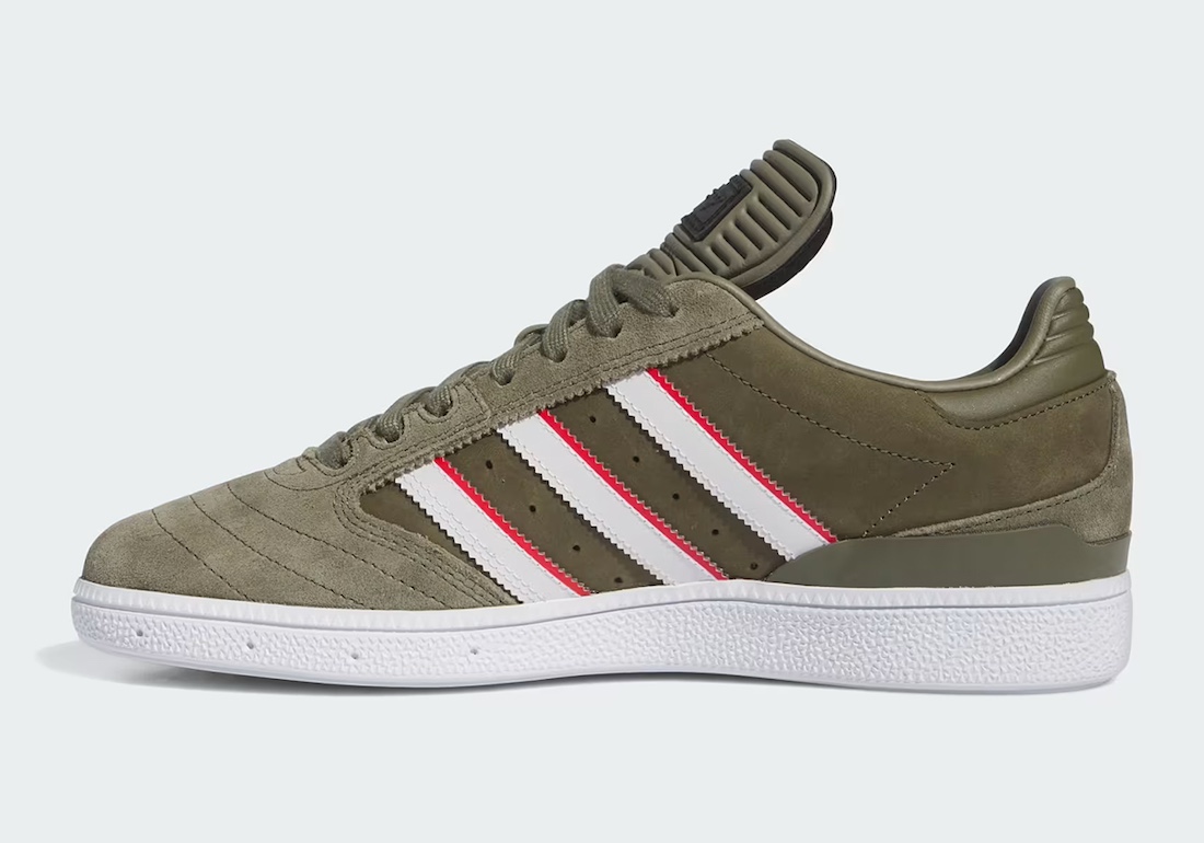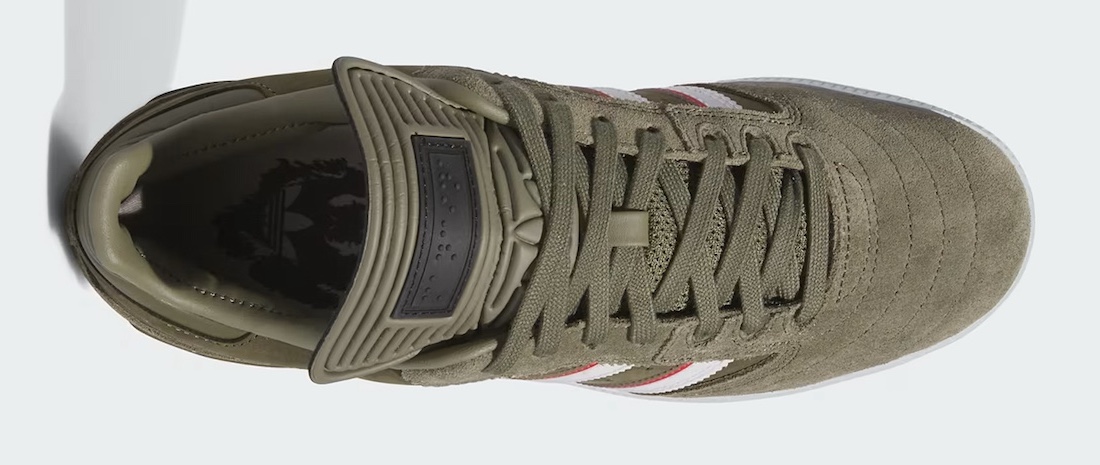 The adidas Busenitz, in Mancina’s custom colorway, features an olive-colored suede upper, complemented by white and red stripes. The most striking feature is Mancina’s last name embossed in braille on the tongue label, a nod to his visual impairment. The shoe also replaces the traditional “Busenitz” text with special branding, adding a unique touch to this already distinctive design.