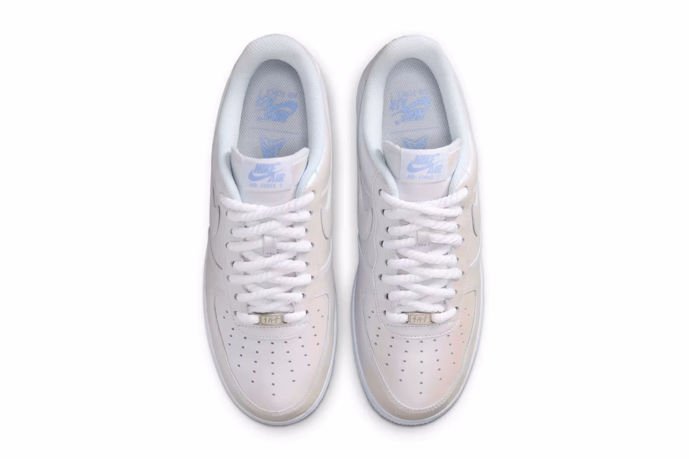 The Nike Air Force 1 is still synonymous with basketball culture, over forty years after its initial introduction in the early 1980s. The silhouette is has transcended to bridge the gap between sport and street styles, and is one of the pillars of modern-day sneaker culture as we know it. Recently, Nike athlete Ja Morant has been working with the AF1 to deliver off-court sneakers to supplement his signature models, currently on their third iteration. Morant’s takes have varied wildly in colors and materials, including a Swarovski covered pair coming soon. This week, another edition of the line has emerged, bringing another gemstone to mind. The “Pearl” edition comes in a metallic silver shade with a slightly chromatic finish to it, giving it the colorful sheen of, well, a pearl. Morant’s 12:AM branding is added in light Cobalt blue, with Nike tags to match.