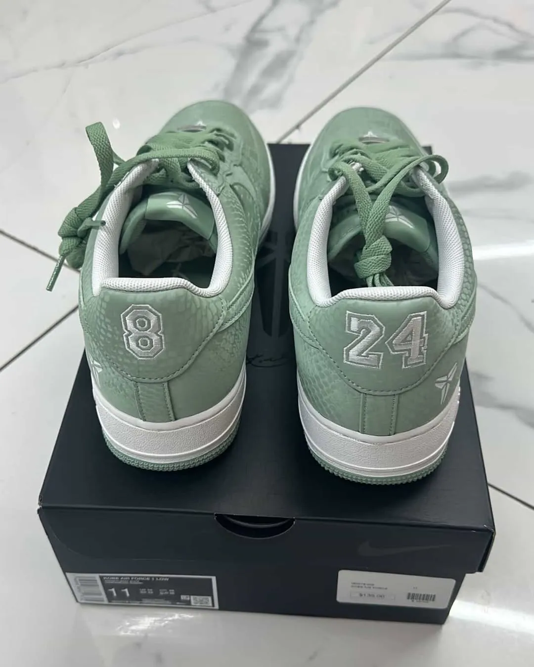 Nike’s newest version of a Kobe Bryant-branded Air Force first arrived last Summer. The new variant is not a part of their Protro series like some recent Kobe releases, which featured a drop-in ReactX midsole as its main performance update. Instead, the new Mamba version applies a snakeskin texture across the entire shoe’s upper, featuring a glossy finish for an eye-catching look. Pairs first landed in a triple white color scheme, followed by several more tonal editions in purple, olive green, and all-black. their first deviation from the tonal look landed in November with the “Lenticular” edition, a greyscale pattern meant to mimic the look of actual snakes. This week, another non-tonal colorway has surfaced, sporting a new “Steam” green tone. The color is a muted, pastel shade of green, a perfect hue for sunnier Spring days. This is paired with white soles and branding to balance out the palette.