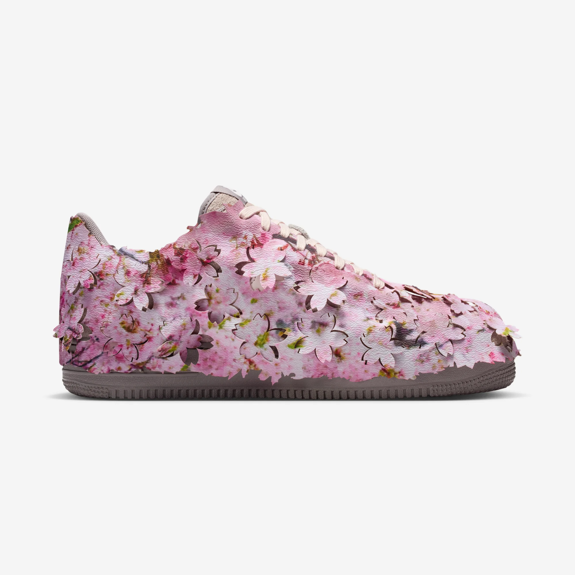 This second pair of the Leaf Air Force 1 appears to be aimed at a Spring release. The pair ditches the Fall palette of brown, green, and orange hues in favor of brighter pastel pink colors. The look is clearly inspired by cherry blossom trees when they reach full bloom in early Spring. The new look comes with a removable outer layer in shades of pink with hints of red and green. Blossom-shaped cutouts giving the look a three-dimensional flower appearance. Underneath, the shoe features a full suede upper, mixing light pink base layers with grey overlays, and a mauve accent to complete the look.