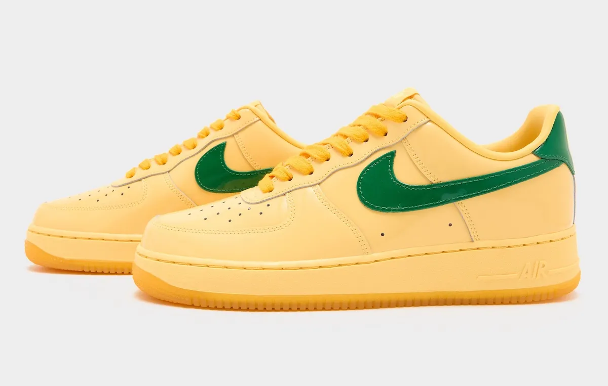 Next Summer, Nike is apparently bringing back the glossy finished look for the AF1. This morning, @sneakermarketRO shared a first look at the new colorway via a single in-hand photo. The pair features an upper constructed entirely from patent leather, a design choice recently only seen on Lil Yachty’s Concrete Boys pairs as well as Lebron’s upcoming AF1 release. The look is primarily cast in a soft “Topaz Gold” shade of yellow, adding a contrasting pine green Swoosh, and darker Laser Orange laces.