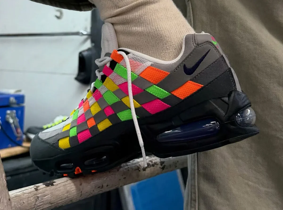 Nike’s new woven style of the Air Max 95 has not been announced for release yet, but will land on shelves sometime in Summer 2026. The new look brings overlapping nylon strips to the AM95’s wavy upper in a checkerboard pattern, using neon accents over a standard grey gradient look. Pairs will be available from both Nike and select retailers for $190.