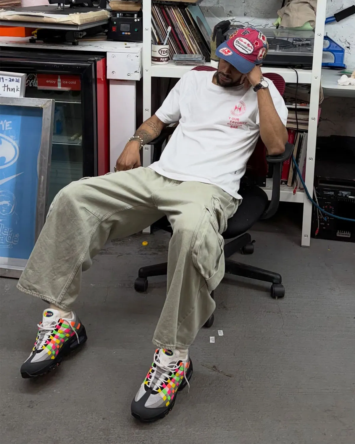 Woven fabrics are as old as as the manufacturing industry itself, and Nike has been incorporating woven elements into their sneakers for decades. In 1996, the Air Footscape Woven went mainstream, blending the shoe’s asymmetrical design with long nylon strips in a traditional weaving pattern. In recent years, other iconic sneakers have donned the simple technology, like last year’s “New Jersey” Air Force or Union’s three-way collab with Bephie’s Beauty Supply. This week, the Air Max 95 has surfaced sporting a woven upper, for the first time since it’s introduction back in 2019. Nylon strips are woven over and under the silhouette’s wavy layered upper, cast in neon shades of green, pink, yellow and orange. The color choice provides high contrast against the grey-to-black gradient of the base look, adding blue Air bubbles underneath and a flash of orange on the outsoles.