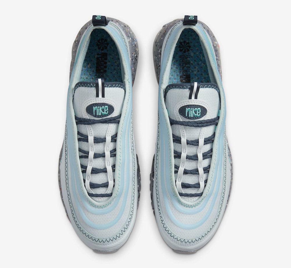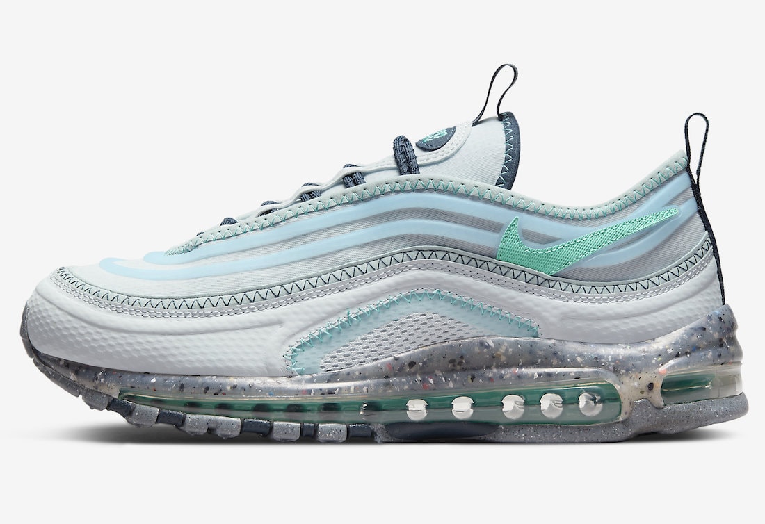 Featuring recycled materials throughout the upper, this AM97 features a mesh and translucent ripstop upper that arrives decked out in a variety of different blue shades throughout the upper along with new materials and exposed stitching which creates a trendy new look to the classic Air Max 97 silhouette. Darker shades are used on the lacing system and sockliner while aqua shades highlight the Nike Swoosh logos on the ankles. Terrascape branding is added to the heels while a grind rubber midsole, green Air Max unit, and a ring outsole complete the brand new design.