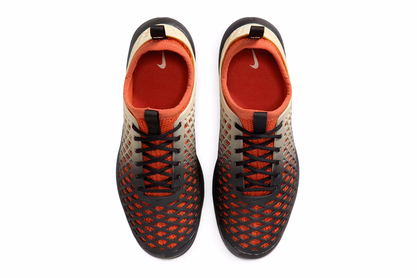 The Air Rejuven8 debuted back in 2008 as part of Nike’s push into post-performance recovery footwear ahead of the Beijing Olympics. Designed for athletes to wear after competition, the shoe featured a breathable mesh bootie wrapped in a lightweight TPU exoskeleton that provided support without pressure. Its slip-on construction and Air-cushioned Phylon sole prioritized comfort and circulation rather than on-court performance. Though short-lived at retail, the futuristic design gained cult status among sneaker enthusiasts. The model’s return last year was first heralded by a CdG collaboration, and has since landed in in-line styles. This week, we have an early look at another standard-issue pair of the model, but this “Rust Factor” look brings some extra options along for the ride. The new look’s TPU cage system features a two-tone gradient, starting in black at the toe before quickly changing to Muslin around the rear. The inner bootie will come in two options the vivid orange Rust Factor shade, as well as a simple all-black option.