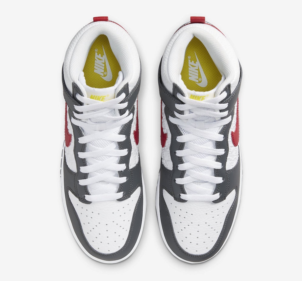 If you were looking for a new dunk High to add to your collection, we have exactly what you’re looking for. Sporting a sleek colorway, the pair of kicks arrives with a white tumbled leather upper across the toes and ankles with embossed hoop logos across the side panelings. For contrast, grey leather overlays are placed throughout while striking red Swoosh logos are featured on the sides. Yellow tongue labels add just a small sample of more color to the rendition while a white rubber midsole and grey outsole complete the design underneath.