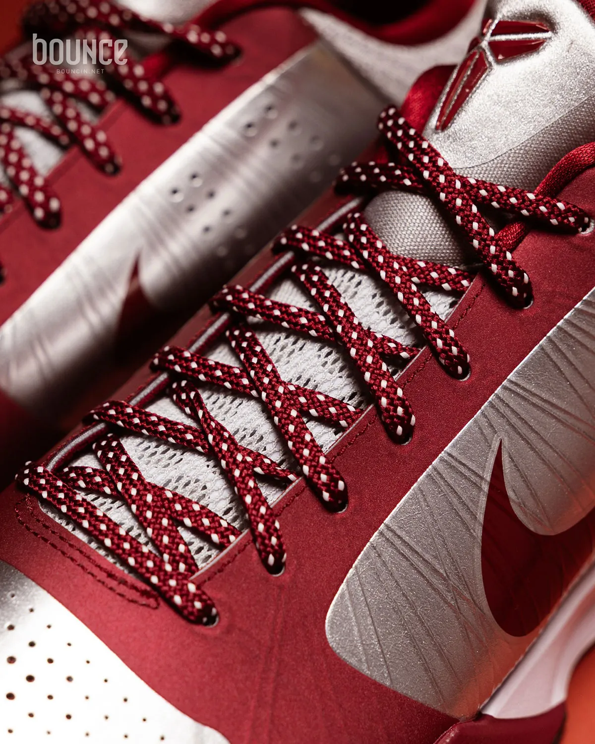 The latest retro Kobe colorway to get a rerelease in the new Protro format is another edition of the Kobe 5, this time from 2010. The “Lower Merion” colorway will likely stick closely to the original, and the early photo here seems to confirm this. The model has the same coloring as the OG, featuring a metallic silver upper paired with a dark Team Red shade for the forefoot, eyestays, and Swooshes. White toes, tongues, and midsoles round out the palette. The photo does not show the heel, so we’ll have to wait to confirm the Aces logo until more pairs emerge.