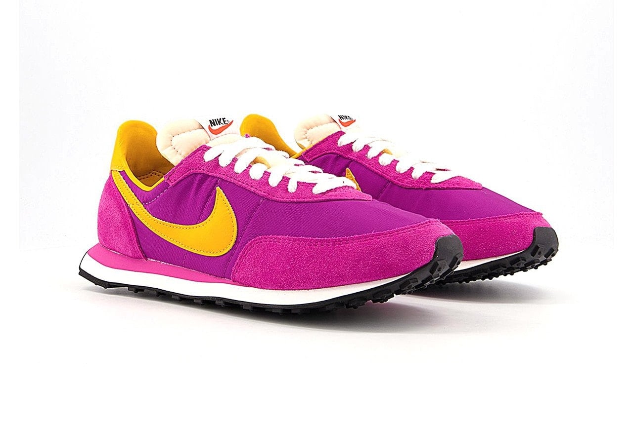 Nike’s Waffle Trainer is one of the brand’s oldest sneakers. Dreamt up by Bill Bowerman himself when he was still the Oregon track coach, the Waffle shoe was intended to give runners better grip on the track and more control over their running. The first samples were made exactly how the name implies- by pouring rubber directly into his wife’s waffle maker to create outsoles. While the initial tests left something to be desired, finally Bowerman struck gold, creating the Nike Waffle Trainer in the process. Now, decades and hundreds of thousands of sneakers later, Nike is paying homage to the original with the revival of the Waffle Trainer 2. This week, the classic silhouette emerged in two new colorways for Spring, a bright mix of pink and yellow for the “Fireberry” look, while the second is much more tame, mixing “Velvet Brown” uppers with gold Swooshes.