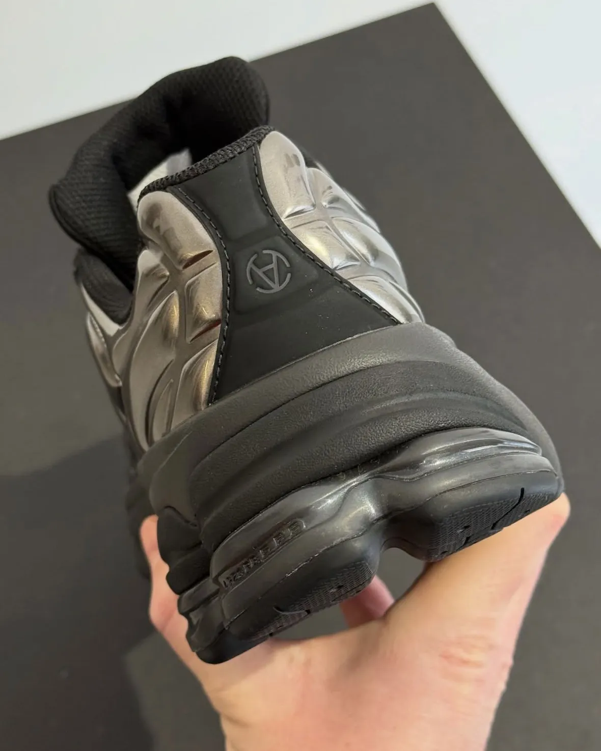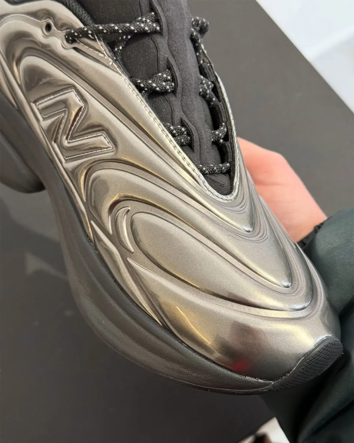 Slam Jam showed up at PFW to showcase some of their upcoming wares for 2026, as well as unveiling a brand new silhouette from New Balance. The Boston company has been present in Paris in some shape or form for several years, typically to show off new models like this 5030. The pair seen here is a collaborative version, so in-line styles of the model could vary greatly in materials and construction. SJ’s take brings a molded upper to the new model, creating the appearance of overlays and depth through patterns pressed into the material, all of which comes in a metallic silver finish. The lacing system is hidden under this stiff outer layer, dressed in black by Slam Jam. Finally, a brand new sole unit is added underneath, featuring a large section of Abzorb cushioning at the heels. While not a 1-to-1 comparison, this new sole shape is reminiscent of Asics’ GEL-Kinetic Fluent silhouette.