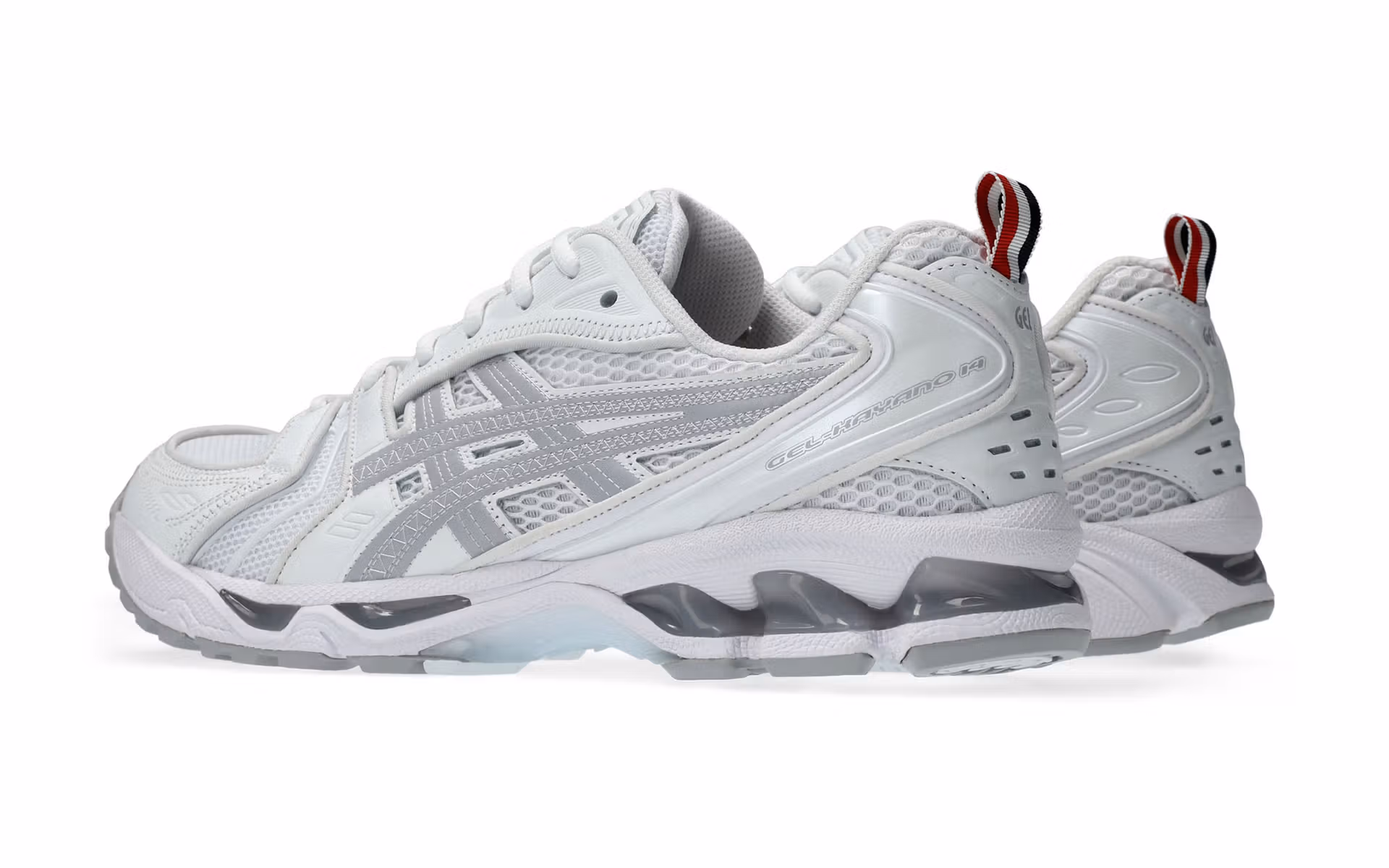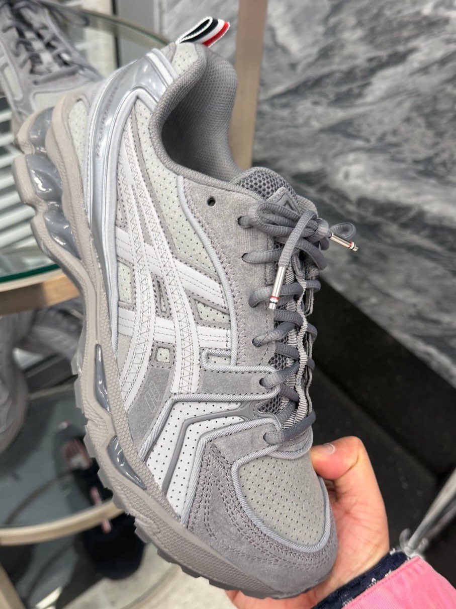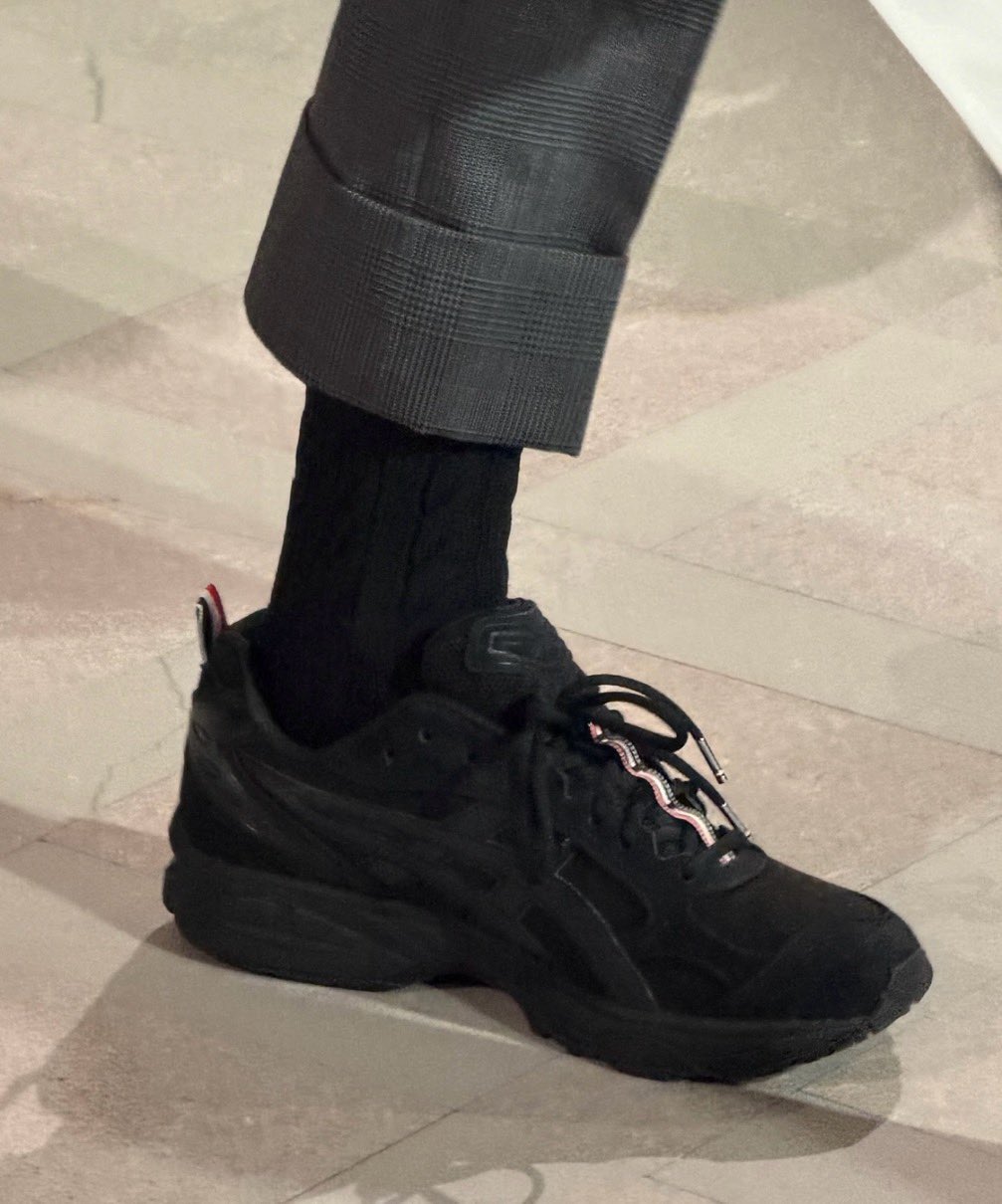 Thom Browne held a runway show over the weekend to preview their upcoming goods for the Fall 2026 season. One of the most shocking parts of the shoe were the Asics trainers on the feet of some models, a first-ever dive into the world of sneakers for the label. The debut collection with the Japanese running brand will bring us three styles of the GEL-Kayano 14, all cast in tonal neutral colorways of steel grey, white, or black. Each pair features Browne’s signature red, white, and blue striping for the heel tabs and a tongue accent. The shoe has been reworked slightly to pack in a few subtle details, including piped edges for each of the suede overlays, zig-zag stitches over the Asics branding, and co-branded, striped insoles.