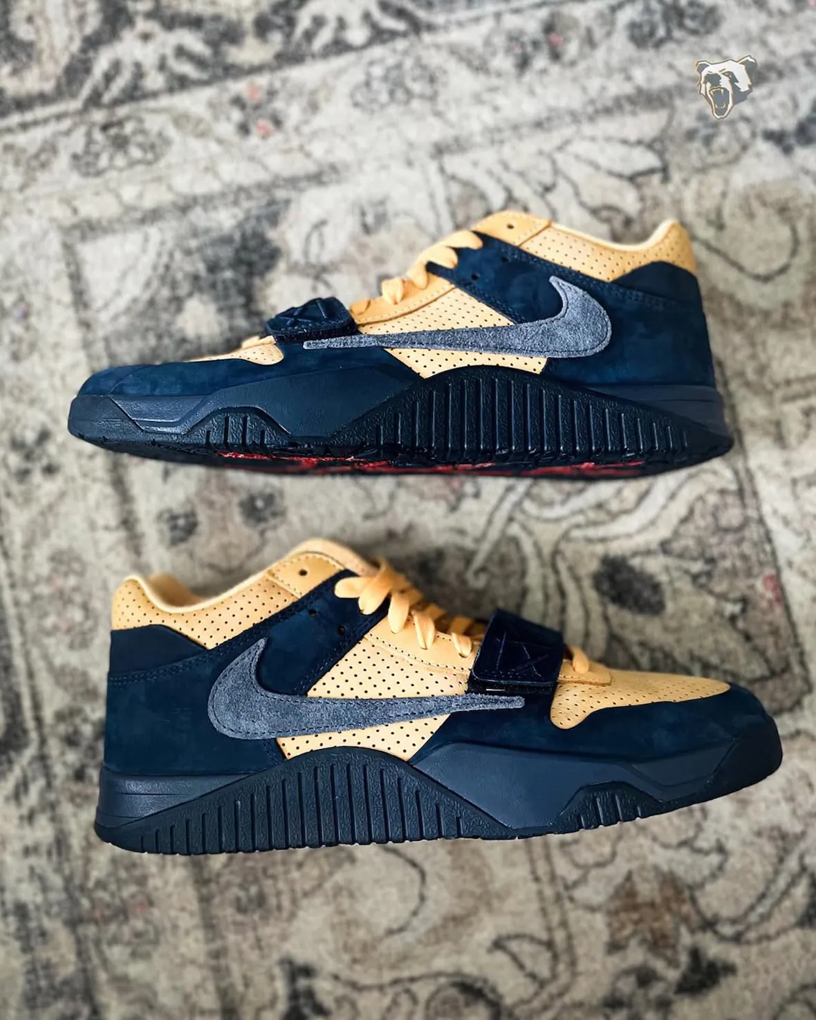 The latest pair of Travis Scott’s Jordan Jumpman Jack silhouette does not have any release information yet, but we hope to see this style hit shelves sometime soon. Likely a s color sample for now, the pair sports a subtle gold base layer with dark navy blue suede overlays and a matching sole unit. Should this pair release, it will likely come with a $200 price tag.
